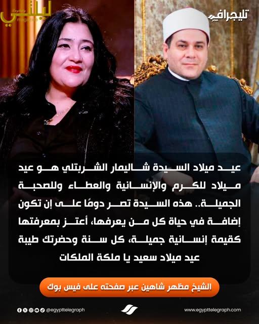 وفي منشور على صفحته بمنصة “فيسبوك” قدم الشيخ مظهر شاهين التهنئة للسيدة شاليمار شربتلي قائلا” “عيد ميلاد السيدة شاليمار، هو عيد ميلاد للكرم والإنسانية والعطاء وللصحبة الجميلة هذه السيدة تصر دوما على أن تكون إضافة مهمة في حياة كل من يعرفها، أعتز بمعرفتها كقيمة إنسانيه جميلة”.