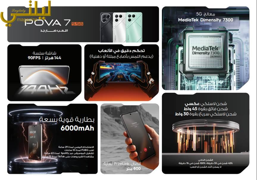 - POVA 7 5G: يأتي هذا الطراز بتصميم مستوحى من الفضاء مع بطارية ضخمة بسعة 6000 مللي أمبير تدعم الشحن السريع بقوة 45 واط، وشحن لاسلكي فائق السرعة بقوة 30 واط. يعمل الهاتف بمعالج MediaTek Dimensity 7300 Ultimate AI الذي يوفر أداءً متميزًا في الألعاب وتعدد المهام، مما يجعل POVA 7 5G من أقوى الهواتف في فئته.
