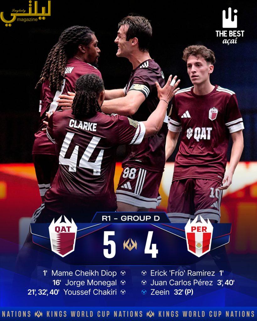 أما المنتخب القطري، فحقق فوزاً مثيراً على منتخب بيرو بنتيجة (5–4) ضمن المجموعة الرابعة، بفضل تألق يوسف شاكيري الذي أحرز ثلاثة أهداف، إلى جانب بصمة زكريا زروال الذي صنع تمريرتين حاسمتين، في مباراة حبست الأنفاس حتى صافرتها الأخيرة.
