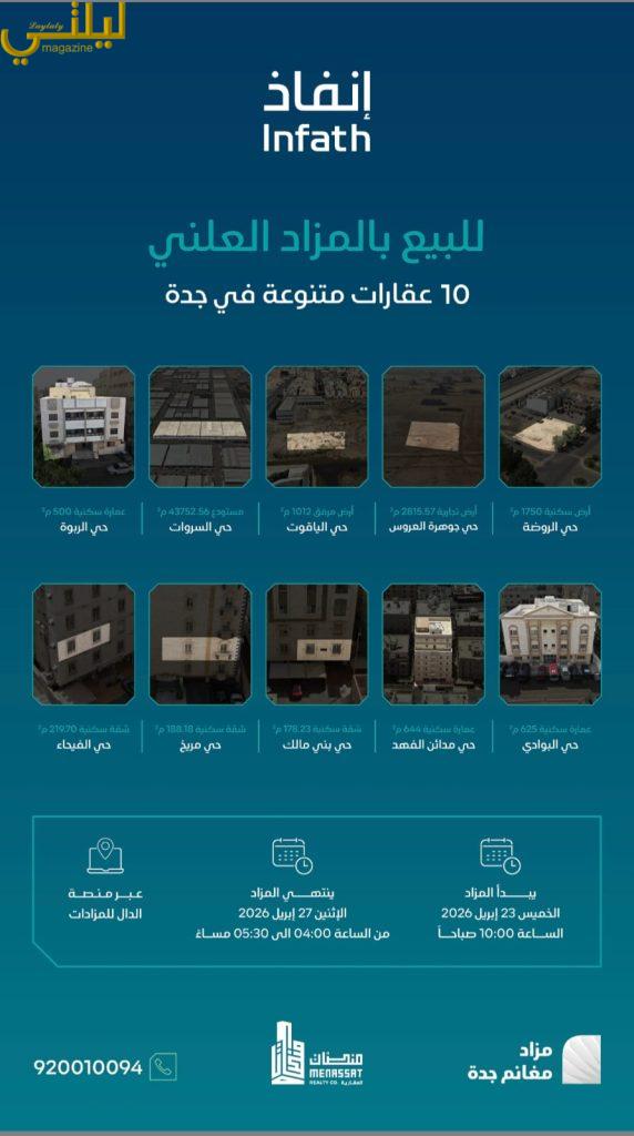 تعلن شركة منصات العقارية عن إقامة مزاد مغانم جدة الإلكتروني لطرح 10 عقارات متنوعة في مدينة جدة تحت إشراف مركز الاسناد والتصفية – إنفاذ, وبقرار من محكمة التنفيذ وبحكم من محكمة الاحوال الشخصية والذي سيُقام يوم الخميس 23 أبريل 2026 في تمام الساعة العاشرة صباحًا حتى يوم الأثنين 27 أبريل، وذلك إلكترونيًا عبر منصة الدال للمزادات
