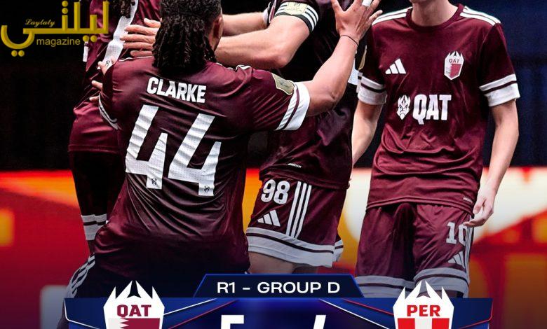 أما المنتخب القطري، فحقق فوزاً مثيراً على منتخب بيرو بنتيجة (5–4) ضمن المجموعة الرابعة، بفضل تألق يوسف شاكيري الذي أحرز ثلاثة أهداف، إلى جانب بصمة زكريا زروال الذي صنع تمريرتين حاسمتين، في مباراة حبست الأنفاس حتى صافرتها الأخيرة.